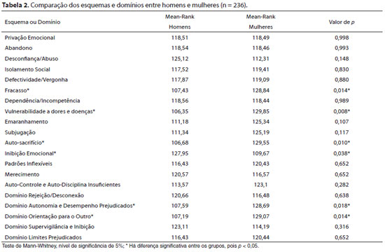 Sabidamente existem importantes diferenças entre homens e mulheres em relação a aspectos psicológicos, o que pode trazer grande impacto na elaboração de estratégias de prevenção e promoção de saúde assim como delineamentos de novas intervenções. Estudo espanhol verificou que mulheres e homens dependentes de álcool diferem significativamente quanto aos sintomas depressivos, sintomas de ansiedade e dificuldade para se adaptar a vida diária, tendo as mulheres maiores pontuações (Bravo de Medina, Echeburúa & Aizpiri, 2008). Recentemente, estudo desenvolvido em Ohio (Sansone & Sansone, 2011), demonstrou que homens e mulheres com Transtorno de Personalidade Borderline (TPB) diferem significativamente com relação aos aspectos comórbidos. Enquanto mulheres com TPB apresentam maior probabilidade de apresentarem transtornos alimentares, transtornos de humor e de ansiedade, os homens apresentam maior probabilidade de apresentarem transtornos por uso de substâncias e transtorno de personalidade anti-social. Corroborando as evidências supracitadas, dados de estudo realizado em 15 diferentes países (África, Américas, Ásia, Europa, Oriente Médio e Pacífico) mostraram que em todos os países as mulheres apresentaram maior prevalência de transtornos de ansiedade e de humor enquanto que os homens apresentaram maior prevalência de transtornos por uso de substâncias (Seedat et al., 2009). Para além disso, existem diferenças de gênero também em estratégias de regulação emocional (Zlomke & Hahn, 2010). De acordo com estes autores, ao se deparar com um evento negativo, a estratégia de refocar no planejamento relaciona-se diretamente com menos ansiedade, estresse e preocupações. Esta estratégia é especificamente mais usada por homens. Já as mulheres, ao se depararem com um evento negativo tendem a aceitá-lo e reavaliarem-no positivamente. Estas estratégias relacionam-se a manutenção de preocupações excessivas entre as pessoas do sexo feminino (Zlomke & Hahn, 2010). O estudo de Garnefski, Teerds, Kraaij, Legerstee e Kommer (2004) ratifica estes dados, sugerindo que as mulheres tendem a usar mais estratégias cognitivas desadaptativas, como reavaliação positiva, ruminação e catastrofização. Os pesquisadores concluem que, provavelmente, as maiores taxas de depressão entre as mulheres podem estar relacionadas a estratégias de enfrentamento menos efetivas. Existem diferenças de sexo também em relação a domínios específicos da auto-estima e empatia, aspectos a serem levados em consideração no tratamento. Homens apresentam escores mais altos nos domínios da auto-estima relacionados à aparência física, atletismo, desempenho acadêmico, self pessoal e satisfação do self. As mulheres apresentam escores significativamente mais altos nos domínios da auto-estima relacionados à conduta comportamental e ética-moral (Gentile et al, 2009). Em relação à empatia, de acordo com pesquisas de bases neurais de ativação do hemisfério cerebral direito, os homens apresentam menor capacidade empática que as mulheres (Rueckert & Naybar, 2008). A terapia cognitivo-comportamental (TCC) é uma das abordagens que mostra maior suporte empírico no tratamento de diversos transtornos psicológicos (Otte, 2011; Murphy, Straebler, Cooper, Fairbum, 2010; Serfaty et al., 2009; Matusiewicz, Hopwood, Banducci & Lejuez, 2010). Jeffrey Young desenvolveu a Terapia Focada em Esquemas (TFE) como uma teoria que amplia os tratamentos e conceitos cognitivo-comportamentais tradicionais (Young, Klosko & Waishaar, 2008; Dozois et al., 2009), integrando técnicas de linhas psicoterápicas distintas. A TFE pressupõe que as problemáticas psicológicas se originam na infância/ou adolescência, introduzindo o conceito de Esquemas Iniciais Desadaptativos (EIDs) como níveis mais profundos da cognição (Young et al., 2008). Os EIDs teriam se formado nas experiências precoces de vida, durante as relações com as figuras cuidadoras. Na infância, estes esquemas tiveram a sua utilidade, uma vez que permitiram a interação com o meio, sendo funcionais para aquele momento e contexto de vida (Young, 2003). Na idade adulta os EIDs, idealmente, permanecem inativos, mas, frente a algum evento externo ou às cognições associadas a determinados acontecimentos de vida, os EIDs podem ser novamente ativados, porém fora de seu contexto original - sendo, portanto, desadaptativos (Claudio, 2009). Os esquemas se originam de necessidades emocionais que não foram satisfeitas na infância (Young et al., 2008) e se caracterizam por serem estáveis, duradouros, incondicionais, autoperpetuáveis, resistentes a mudança, significativamente disfuncionais e recorrentes, além de estarem ligados a altos níveis de afeto (Young, 2003). Os EIDs são utilizados para caracterizar e explicar uma série de transtornos de personalidade, representar fatores predisponentes para o desenvolvimento e manutenção de sintomas clínicos, assim como para explicar tipos distintos de problemas interpessoais (Hoffart et al., 2005). Alguns estudos que objetivaram verificar a existência de diferenças entre os EIDs de homens e mulheres já foram realizados. A pesquisa desenvolvida por Shorey, Anderson e Stuart (2012) comparou a severidade dos EIDs entre homens e mulheres dependentes de álcool e encontrou que as mulheres apresentaram escores mais altos em 14 dos 18 esquemas avaliados. Outro estudo (Shorey, Stuart & Anderson, 2012), realizado em adultos dependentes de opióides investigou a existência de associação entre os EIDs e o sexo e demonstrou que as mulheres apresentaram escores significativamente mais altos em três dos cinco domínios esquemáticos em comparação com os homens: subjugação, auto-sacrifício e abandono. Diferenças de sexo quanto aos esquemas também foram encontradas no estudo de Simmons e Granvold (2005) em adultos com memórias traumáticas. De acordo com os autores, os esquemas sobre o se